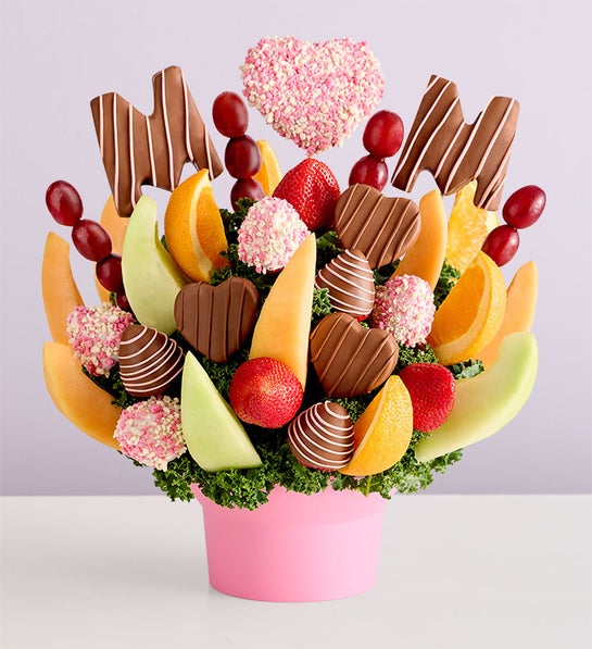 Celebrate the best in the bunch: Mom! Our sweet fruit arrangement is filled with dipped and drizzled pineapple hearts and decadent strawberries along with dipped pineapples that spell out “M-O-M” with a delightful heart-shape “O.” We’ve served it up in a pretty pink bowl for the perfect Mother’s Day surprise. Add a balloon to make it extra special.